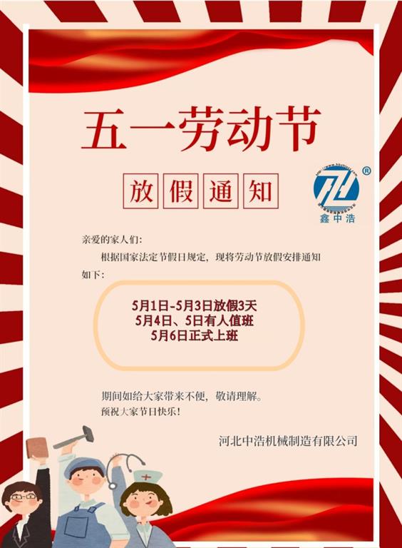 五一劳动节,根据国家法定节假日要求,河北中浩机械制造有限公司对节假日做出以下安排: