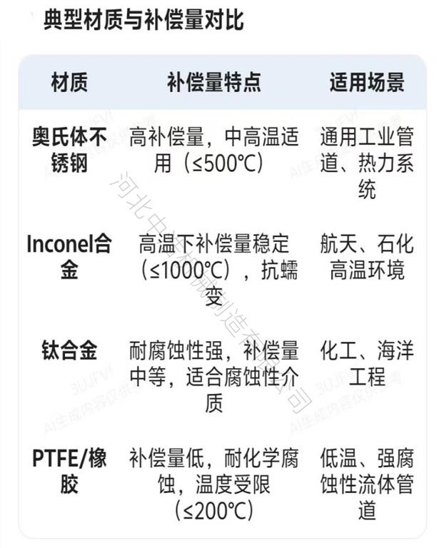 疲劳寿命与循环补偿能力,例如316不锈钢或镍基合金 属于高疲劳强度材质,可承受多次循环变形,长期保持设计补偿量。而普通碳钢属于低疲劳强度材质,易遭受反复变形后开裂,而补偿量逐渐下降。从腐蚀性方面考虑,哈氏合金、钛合金,属于耐腐材质,在腐蚀性环境中,不易劣化,补偿量稳定,而普通304材质在弱酸环境中易腐蚀减薄,从而导致补偿量异常增大造成泄露。从材料厚度方面考虑,薄壁材料补偿量较大,但承压能力较低,一般是用低压系统,而厚壁材料,补偿量较小,但可耐高压。因而在选择时需要综合补偿量与强度关系。在选择时还可参照典型材料与补偿量对照表:
