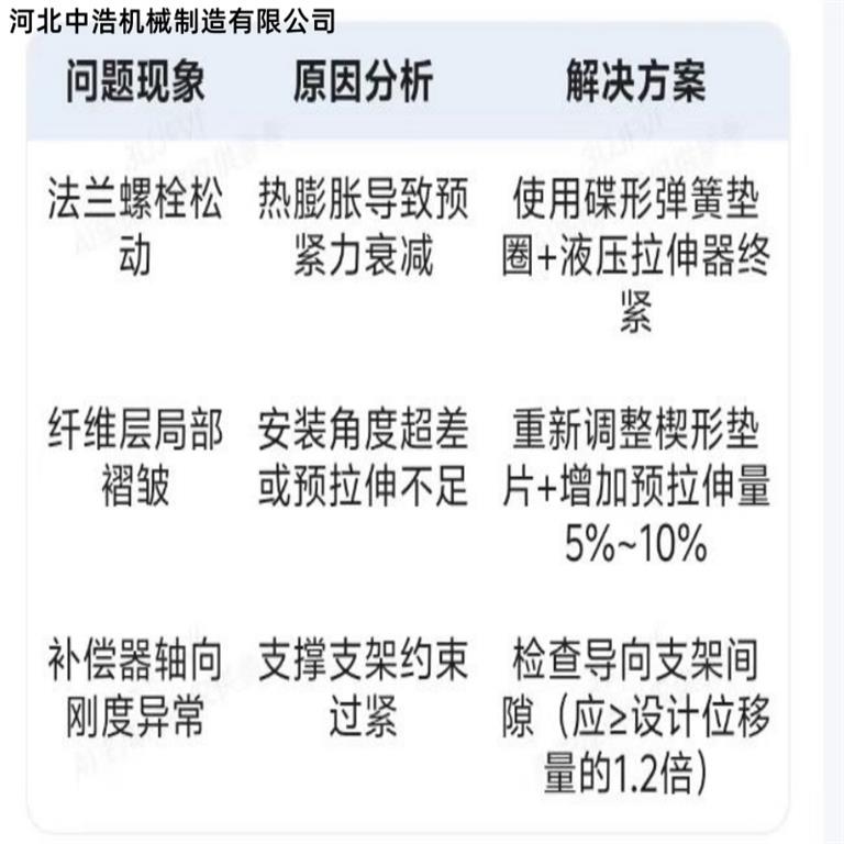 纤维织物补偿器在安装时避免不了安装误差,为了解决安装误差问题中浩机械总结主要可从安装前零误差测量和定位到预变形量调整,其次对支撑结构进行优化,分阶段紧固与应力调整,安装后进行试验测试,从而总结常见问题及解决方法。
