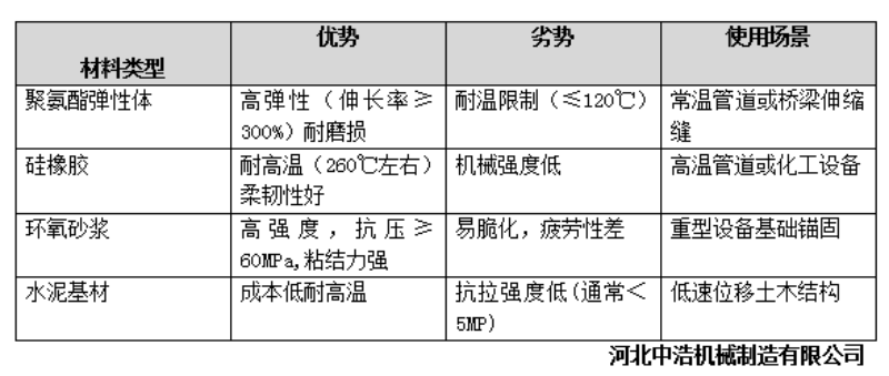 力学性能主要体现在弹性模量和抗拉抗压强度以及断裂韧性,低弹性材料柔韧性好可适应较大位移变形,减少应力集中,高弹性材料(如混凝土)易因刚性过渡而开裂。抗拉抗压强度高强度材料如(环氧树脂)可承受更大载荷和频繁位移,使用寿命长。而低强度材料易在动态载荷下疲劳损坏。针对断裂韧性问题,可用高韧型材料,可抑制微小裂纹引起的断裂。从耐久性考虑高温环境载300℃以上可选用硅酮胶等耐温材料,普通材料极易发生脆化。考虑耐化学腐蚀化工厂环境需要抗酸碱材料,例如氟橡胶,避免腐蚀失去密封性。而耐腐性需要选择对紫外线敏感材料如(聚氨酯)添加抗老剂,避免使用开裂现象。考虑界面强度和搜索率,如低粘性材料(如普通水泥砂浆)极易与金属基体脱粘,导致渗漏。而高收缩材料(如固化环氧树脂)可能因收缩应力引发断裂,需要添加膨胀剂。从膨胀系数考虑,不同材质不同。从施工适应性考虑流动性和固化时间,狭窄缝隙需高流动材料,可用自流平聚合物,确使填充紧密。从固化时间考虑,如果抢修时间短可用双组分聚氨酯,凝聚时间较短。但需要控制施工进度。一般情形可参照材料对比表: