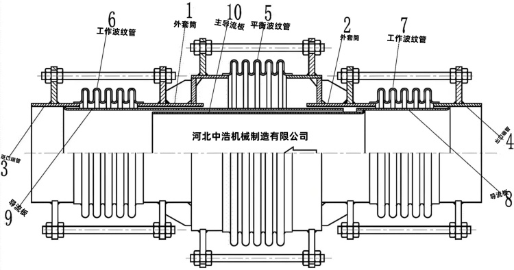 工作原理,当管道热胀冷缩产生轴向位移时,工作波直接吸收管道轴向伸缩/压缩变形;介质内压会在波纹管上产生巨大轴向推力(盲板力);利用平衡波纹管+拉杆受力结构,使工作波内压推力与平衡波内压推力相互抵消、自平衡;管道支座不受内压盲板力,仅承受管道自重、少量摩擦力,无需设置大型固定支座,只设简易导向支座。